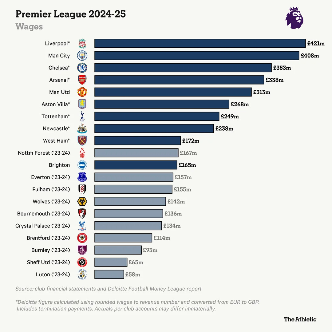 But what I really want you to pay attention to is ‘plucky Liverpool’ who moved to become the highest spenders in the league. They spend £83m more a year than us. What does that mean for squad building? It means they can afford to have 6.38 extra players in their 23-man squad earning £250k a week.
