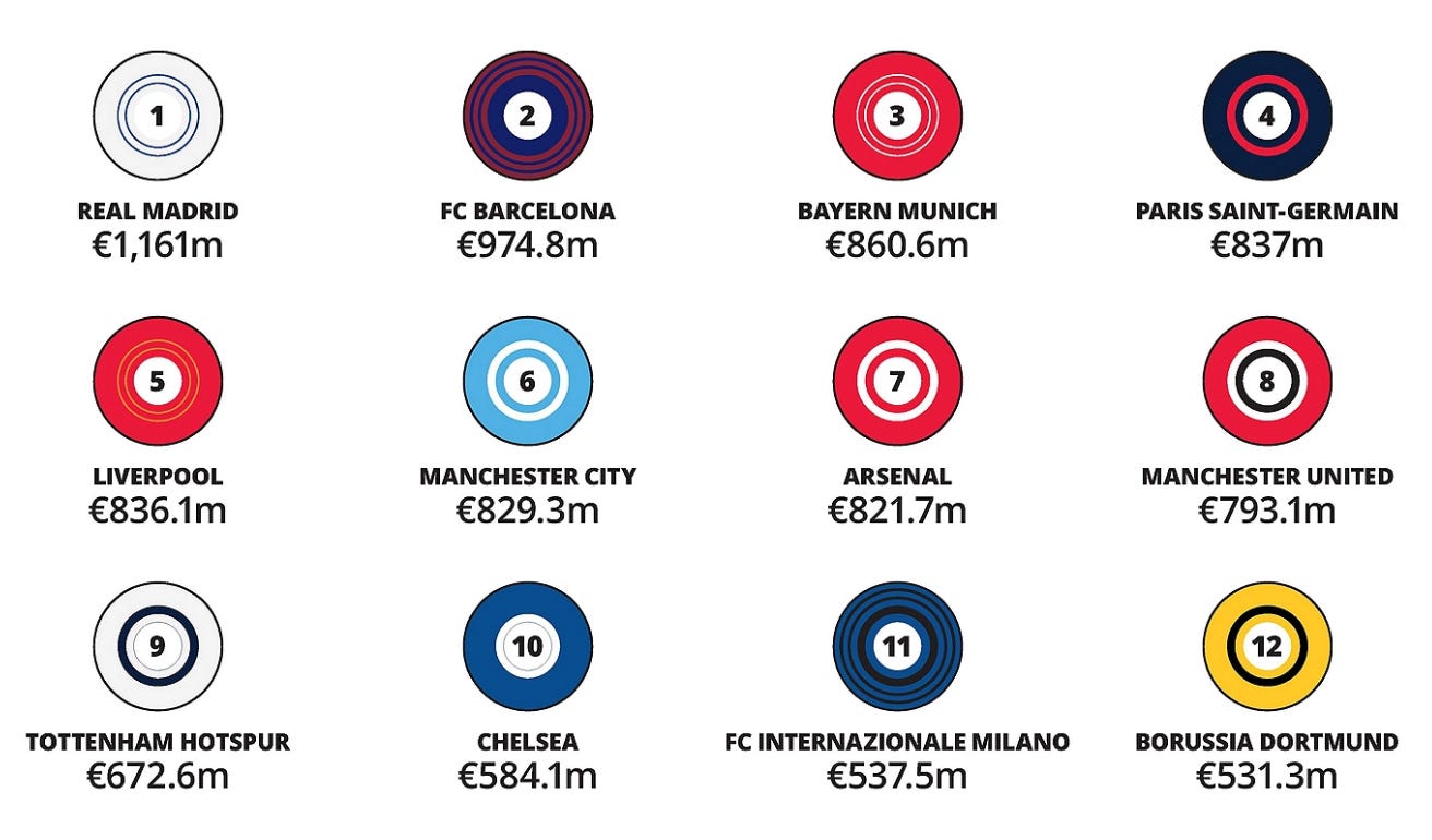 And this: Just 42m euros splits the top 4 Premier League teams. Notably, the European whingers of Barca and Real Madrid, who can’t survive without a Super League, are topping the charts with a combined revenue of 2 billion Euros. Quite staggering. Bayern and Paris make up the other two spots ahead of the Premier League clubs.