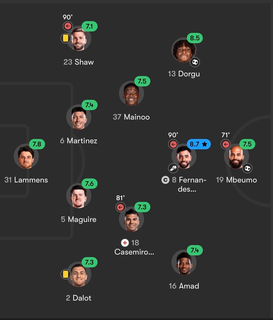 That line-up is about as sexy as a totalled Toyota Prius - it lacks speed and power in midfield, Martinez is a tiny human against set-piece bullies, and a nightmare as a centre-back. Luke Shaw and Dalot have their moments at full-back, but they aren’t special. The keeper is barely an upgrade on André Onana. But with United, it’s always about their attackers, and Mbeumo and Fernandes tend to create a lot of magic on a consistent basis. Cunha and Sesko are both capable of moments. Even Mason Mount has a madness in him occassionally.