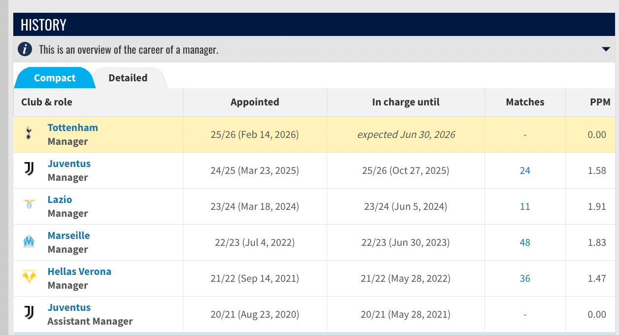 I couldn’t fathom a hire this bad because even the worst managers I could imagine have at least managed to attract my attention. You know this hire is probably going to be a poor one because the most interesting thing from his presser was he shook the hands of all the journos before it started. I’m just trying to imagine the meeting where Paratici or Lange told an under-fire Vinai that the only name they could find for Spurs, a massive club on paper, was someone Vinai would only have known if he was playing Championship Manager as a kid (that’s how I knew him, seriously).
