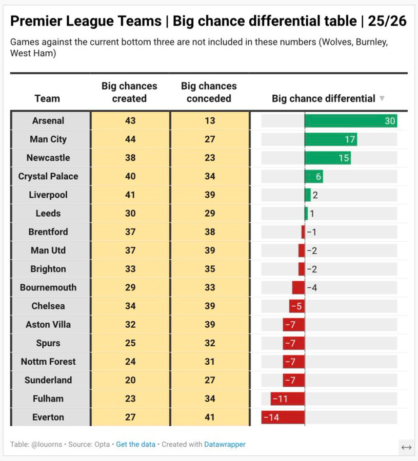 I don’t like the big chance creations stat, unless it works in my favor, but look at how many big chances we’re creating compared to our rivals. Only City have more and it’s one. I’m gonna go out on a limb here, if a system that creates that many big chances isn’t for a striker, maybe it’s not the fault of the system here?