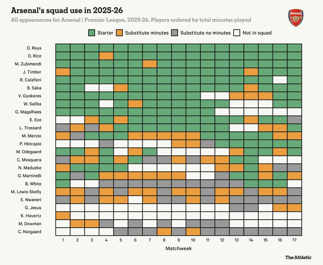 What I would like to see is the training schedule, and I would like someone to list out the amount of training ground injuries we’ve had this season. Hincapie, Timber, Saliba, and Calafiori are four I can think of off the top of my head. Rotation is one of the tools you can use to maintain freshness, but days off and lighter training sessions in crunch moments is the other. You could be rotating well in games and blasting teams in training sessions and end up with the same outcomes.