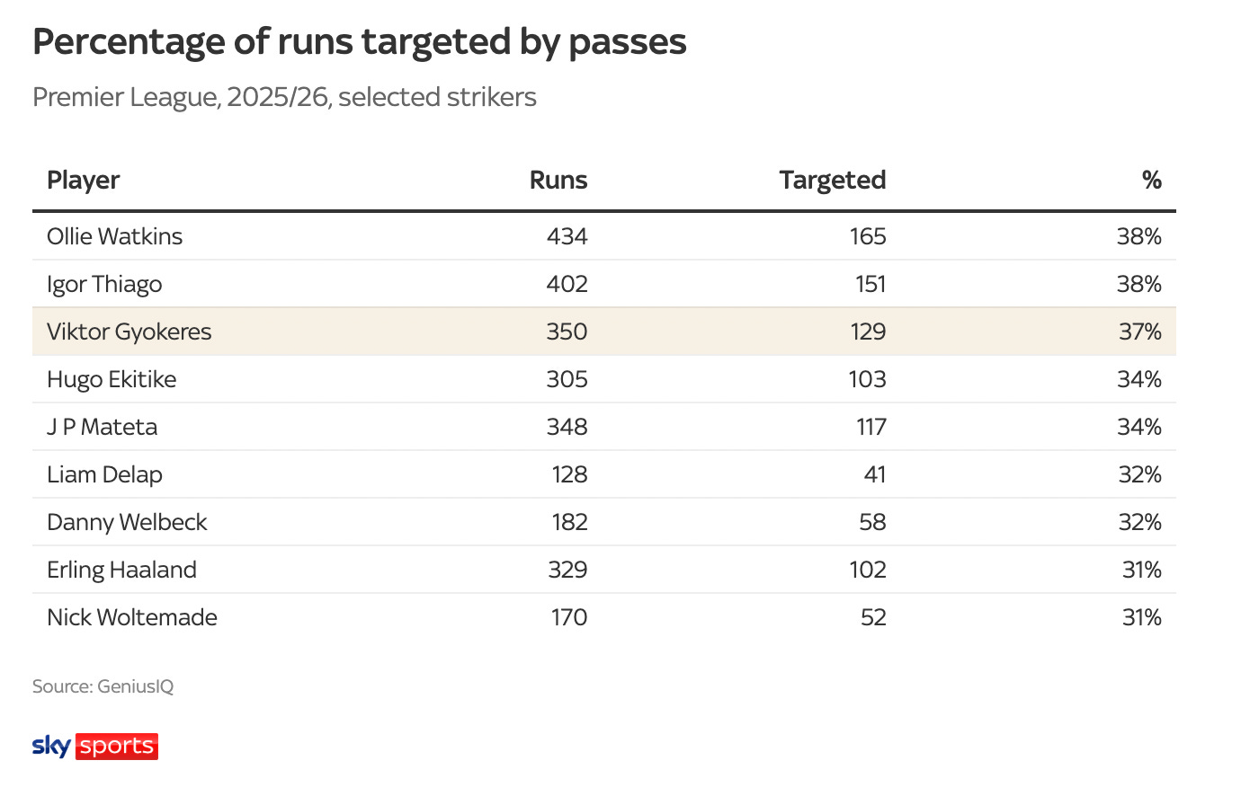 Then we had the story that Arsenal players weren’t finding his runs after the Wolves game before Nick Wright blasted open that idea by pointing out that Arsenal players have dropped the most central through balls in the league and Viktor actually gets better service into him than Ekitike, Woltemade, Haaland, and Danny Welbeck.